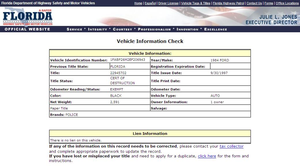 Using the State of Florida DMV Vehicle Information Search Function to search for VINs,