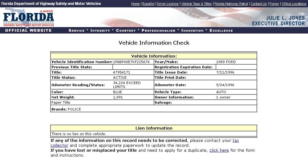 Using the State of Florida DMV Vehicle Information Search Function to search public records on vehicles, we have found title information on cars within the suspected range of VINs that show a Police Branded title. This car has a Police Branded title, and is within the range of suspected FHP Mustangs from DSO #21-0266. ![]() |