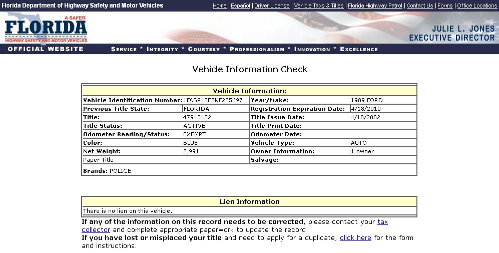 Using the State of Florida DMV Vehicle Information Search Function to search public records on vehicles, we have found title information on cars within the suspected range of VINs that show a Police Branded title. This car has a Police Branded title, and is within the range of suspected FHP Mustangs from DSO #21-0266.