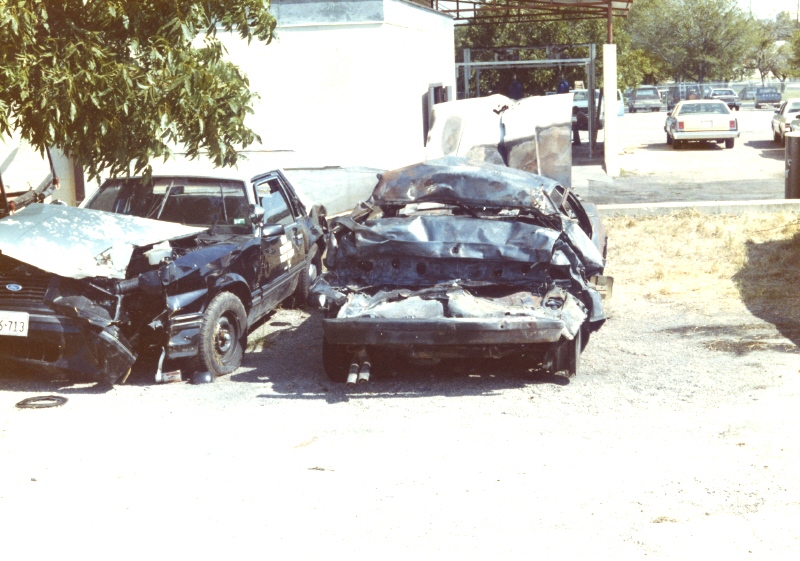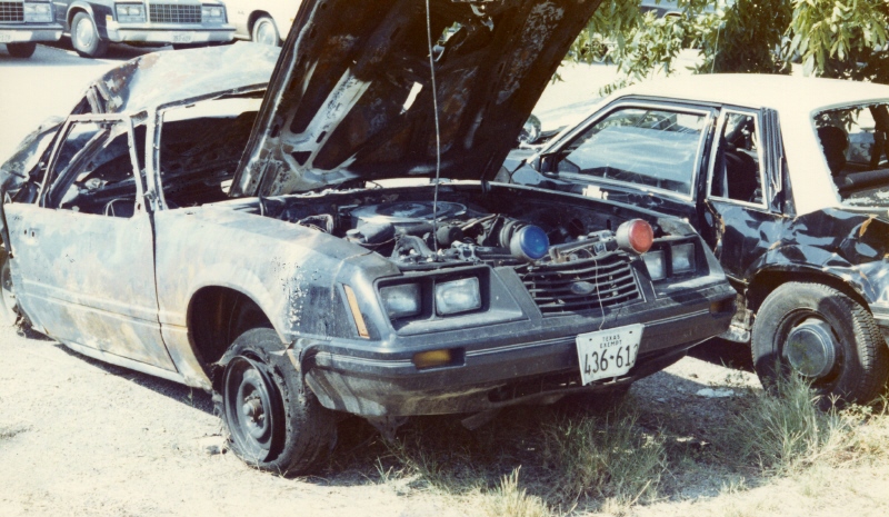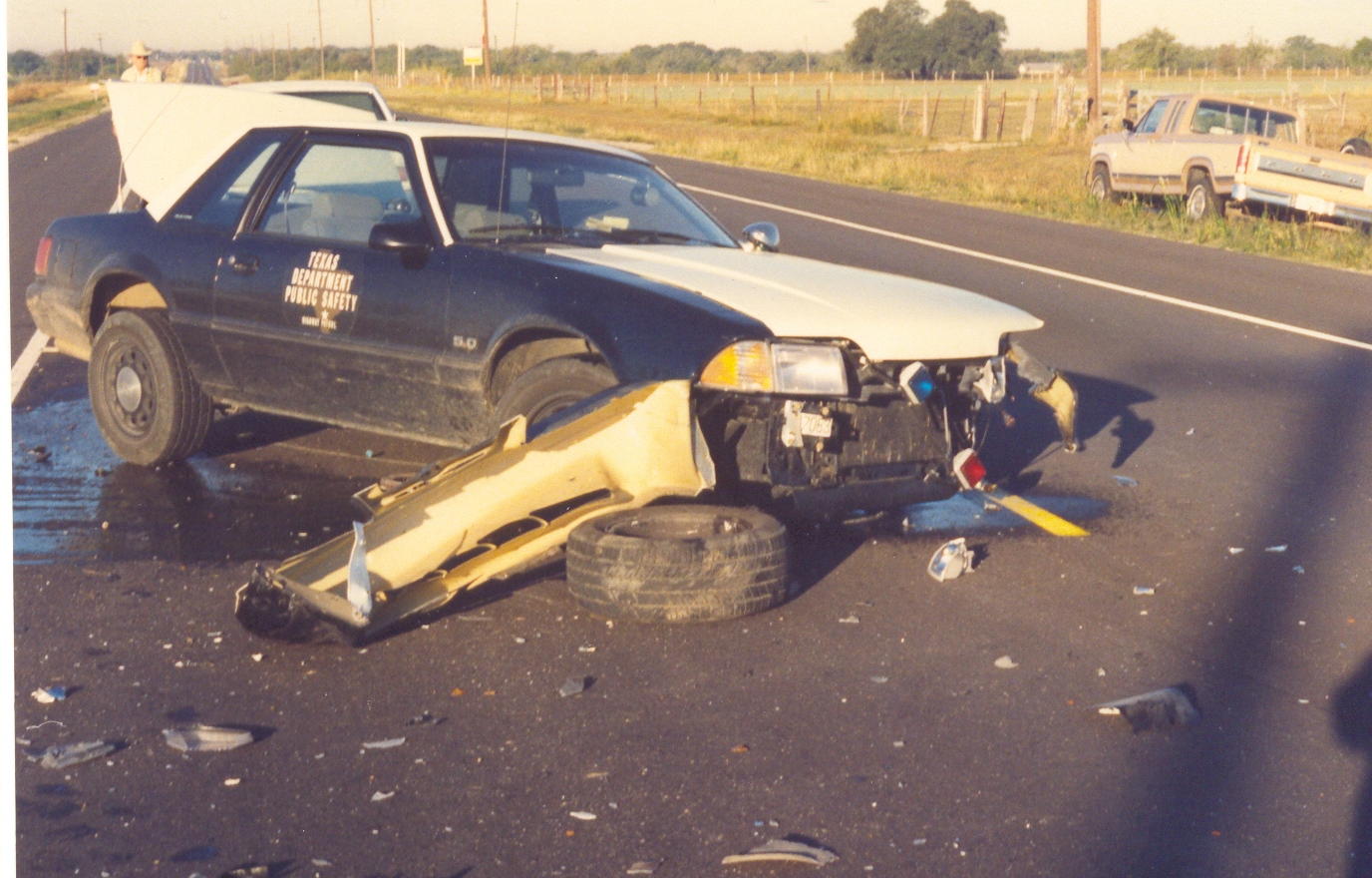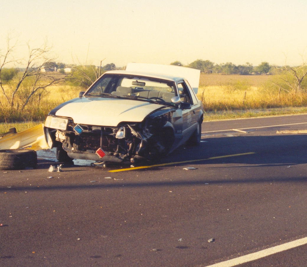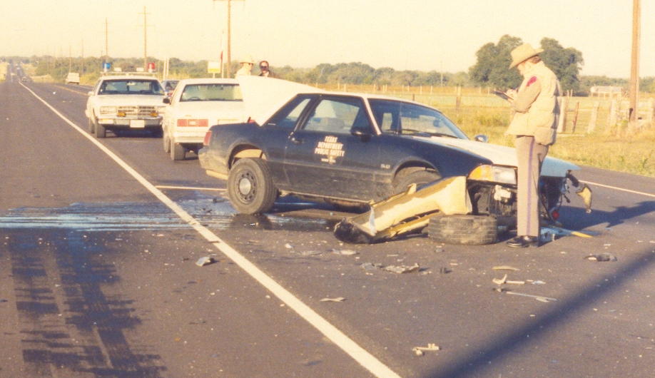 The top three pictures are of a 1987 Texas Highway Patrol Ford Mustang. This picture was made in 1988 or 1989. A Texas State Trooper was on routine patrol on U.S. Highway 90 in Guadalupe county near Seguin, Texas when obviously an accident occured. Trooper was not injured. Bad front end damage! Photo courtesy of Trooper Mike Cantu, THP-Seguin.
