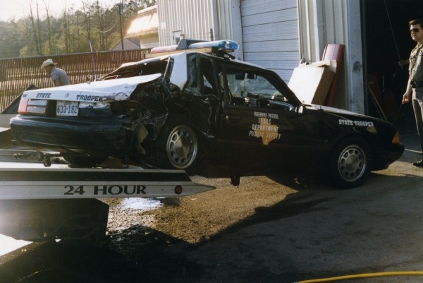On the night of March 23, 1996 Troopers Kevin Malone and Kervin Largent were on routine patrol on U.S. Highway 59 between Lufkin & Diboll in Angelina county. The troopers were turning around at a crossover and waiting for the traffic to clear when they were broadsided by an intoxicated motorist in a pickup truck. Both troopers escaped with only minor injuries. The intoxicated driver was taken to the Angelina county jail. This Mustang had black interior & a 5-spd manual transmission. It was driven by Trooper W.L. Kirkland prior to his transfer to Austin. This picture comes to us courtesy of Trooper Bryan Henry, THP-Lufkin (seen at far right in picture).