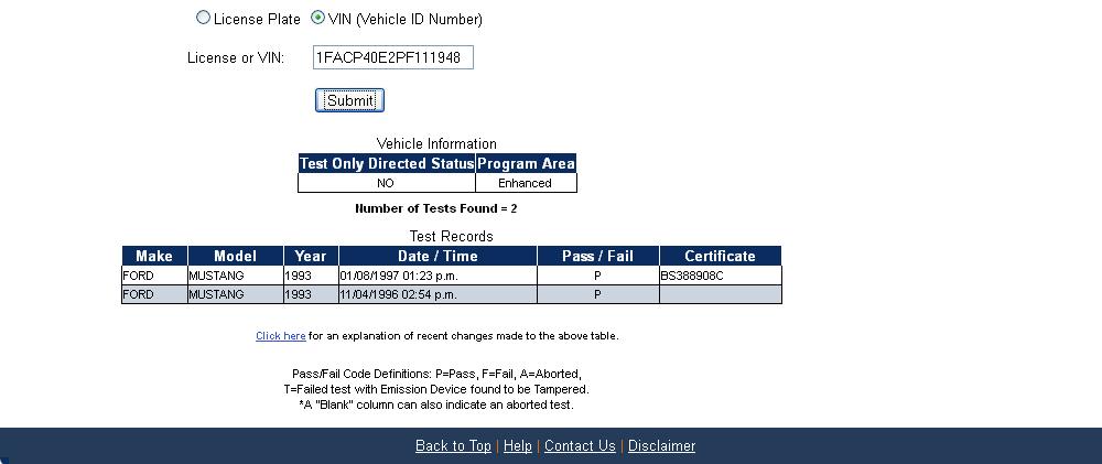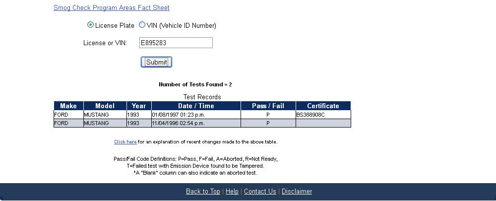 Using the State of California Smog Certificate Website to search for VINs and