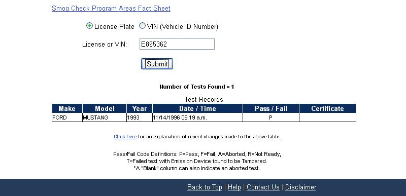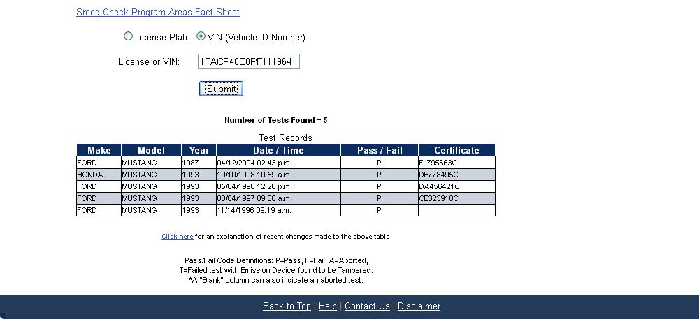 Using the State of California Smog Certificate Website to search for VINs and