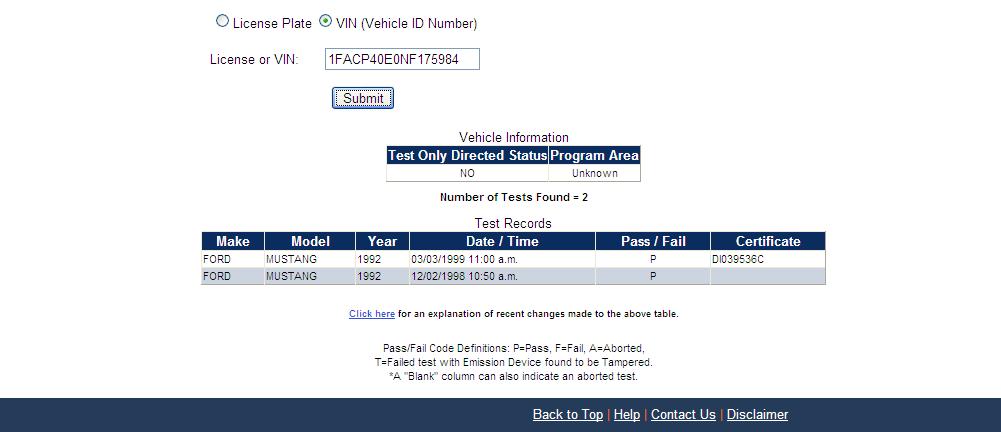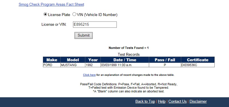 Using the State of California Smog Certificate Website to search for VINs and