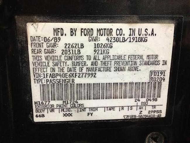 1989 SSP - VIN 1FABP40E6KF277992