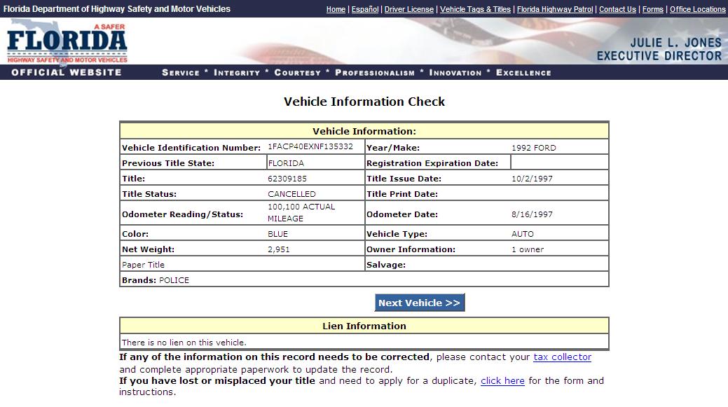 Using the State of Florida DMV Vehicle Information Search Function to search for VINs,