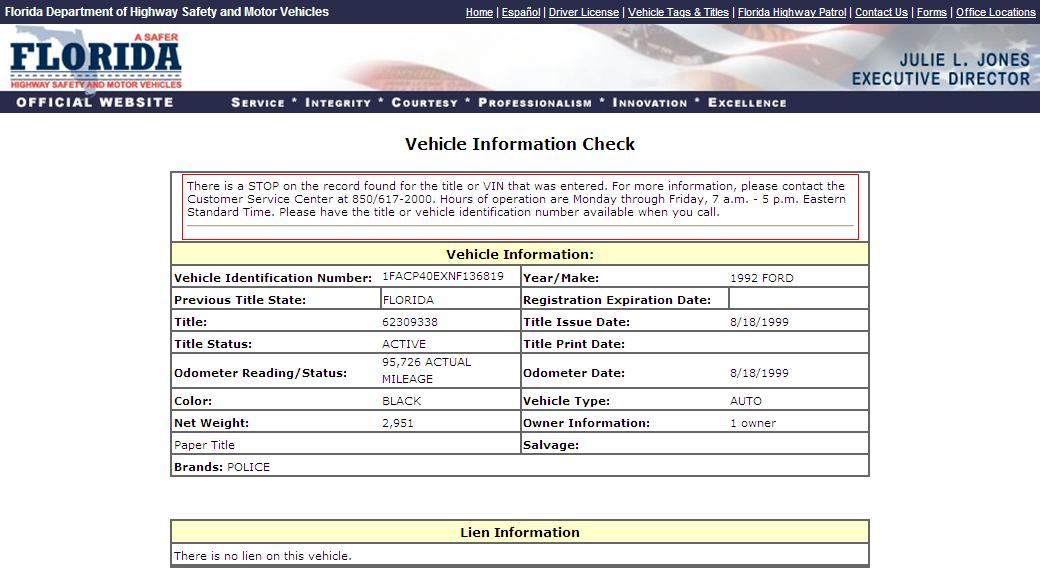 Using the State of Florida DMV Vehicle Information Search Function to search for VINs,