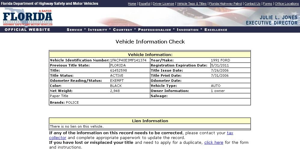 Using the State of Florida DMV Vehicle Information Search Function to search for VINs,
