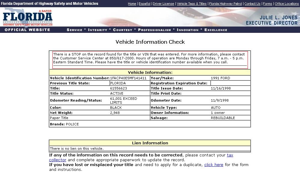 Using the State of Florida DMV Vehicle Information Search Function to search for VINs,
