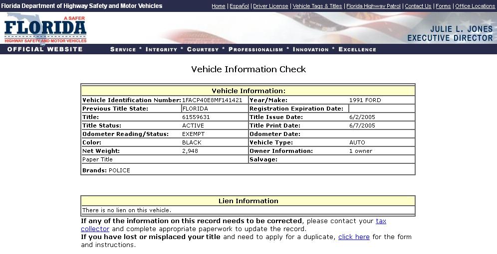 Using the State of Florida DMV Vehicle Information Search Function to search for VINs,