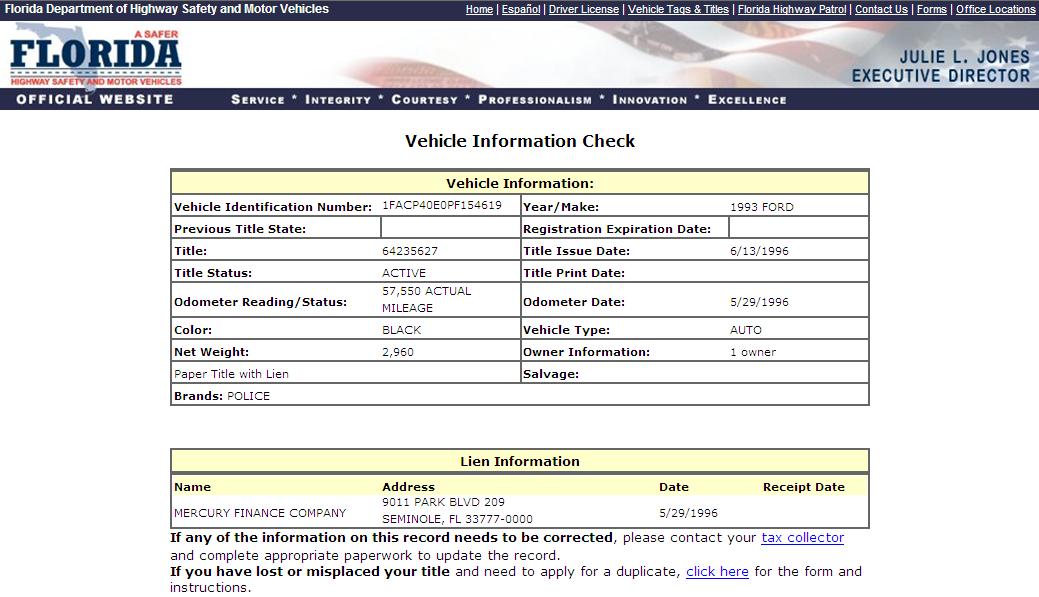 Using the State of Florida DMV Vehicle Information Search Function to search for VINs,