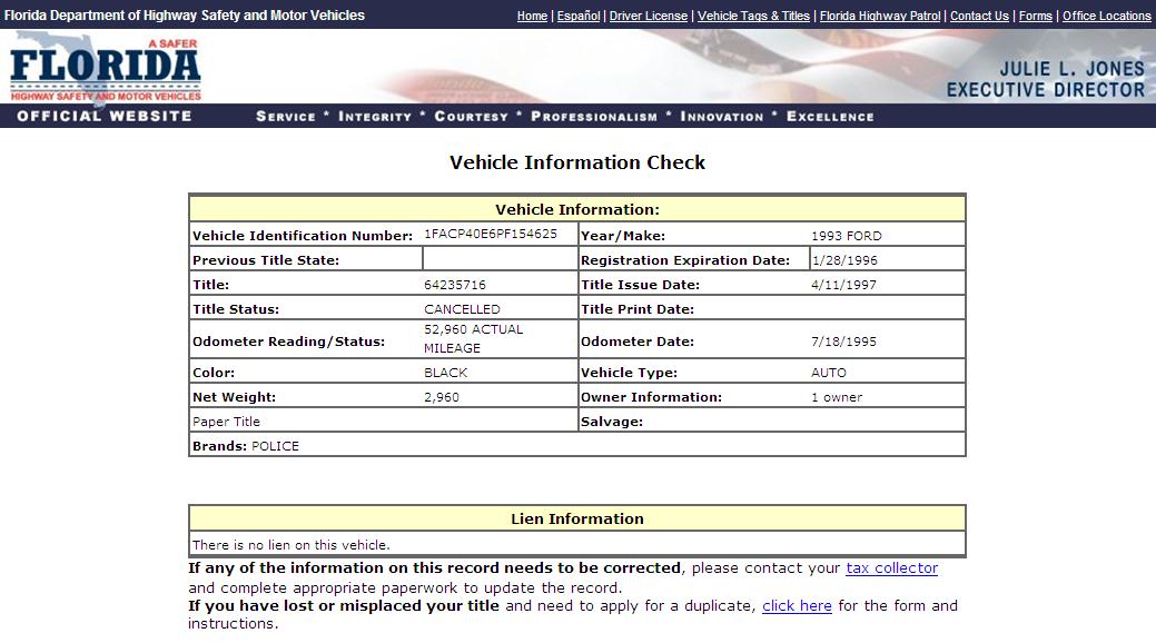 Using the State of Florida DMV Vehicle Information Search Function to search for VINs,