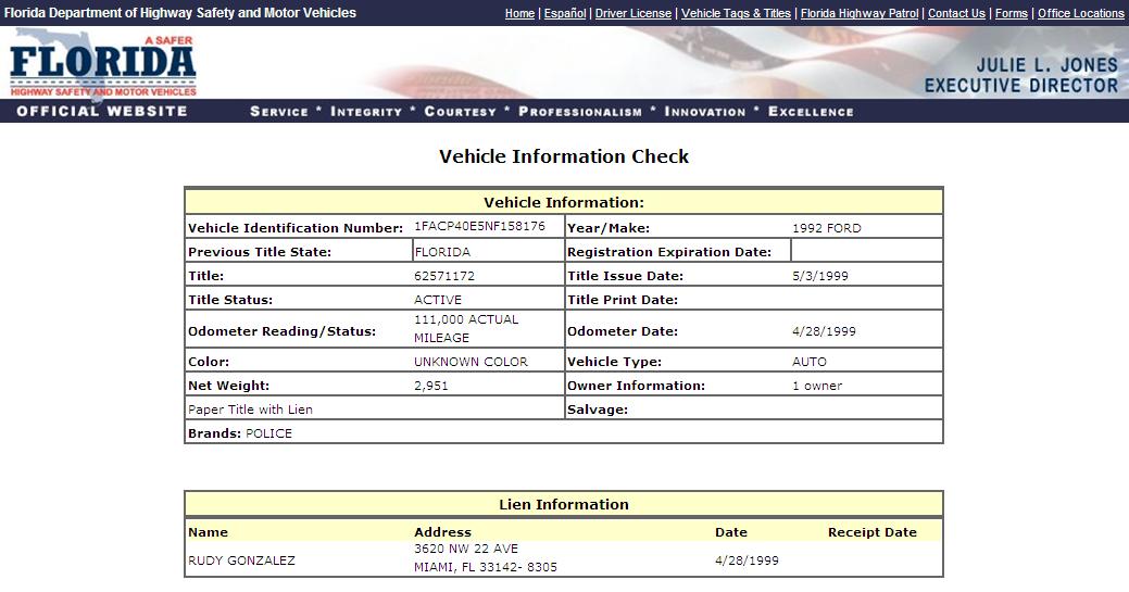 Using the State of Florida DMV Vehicle Information Search Function to search for VINs,
