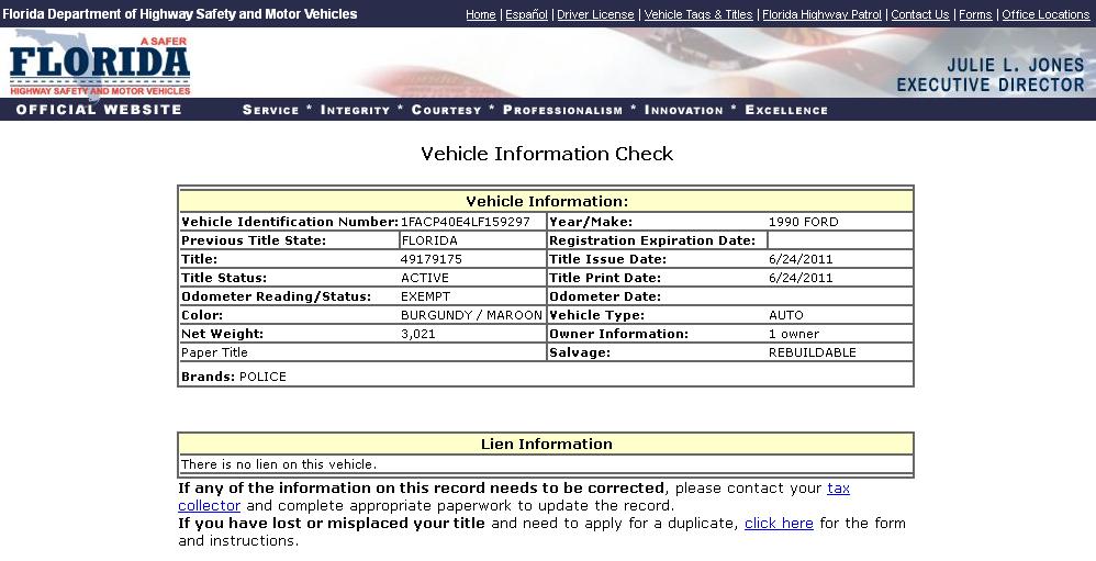 Using the State of Florida DMV Vehicle Information Search Function to search for VINs,