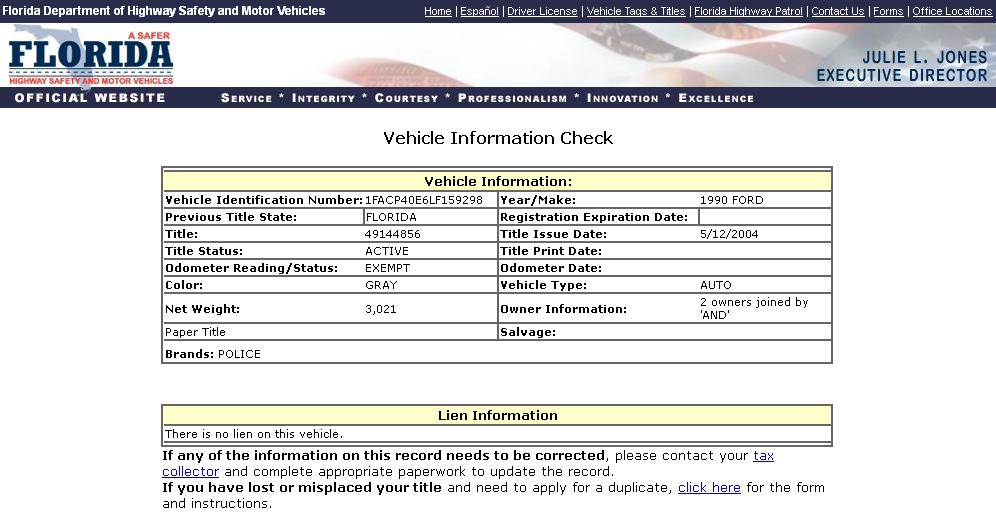 Using the State of Florida DMV Vehicle Information Search Function to search for VINs,