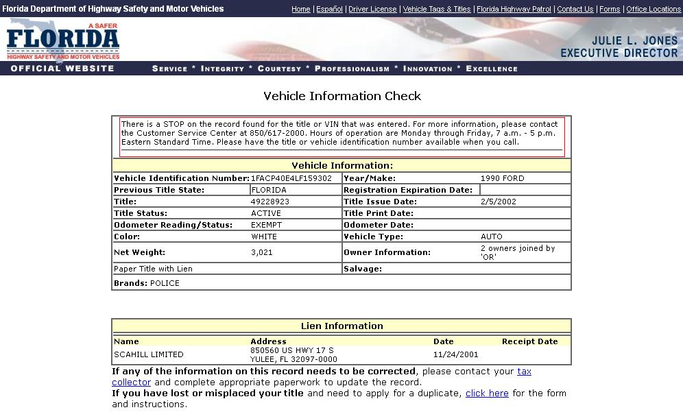 Using the State of Florida DMV Vehicle Information Search Function to search for VINs,