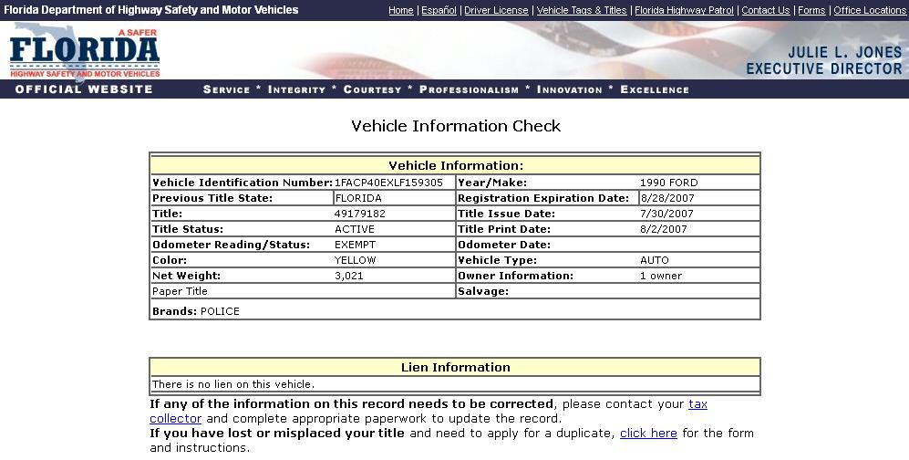 Using the State of Florida DMV Vehicle Information Search Function to search for VINs,