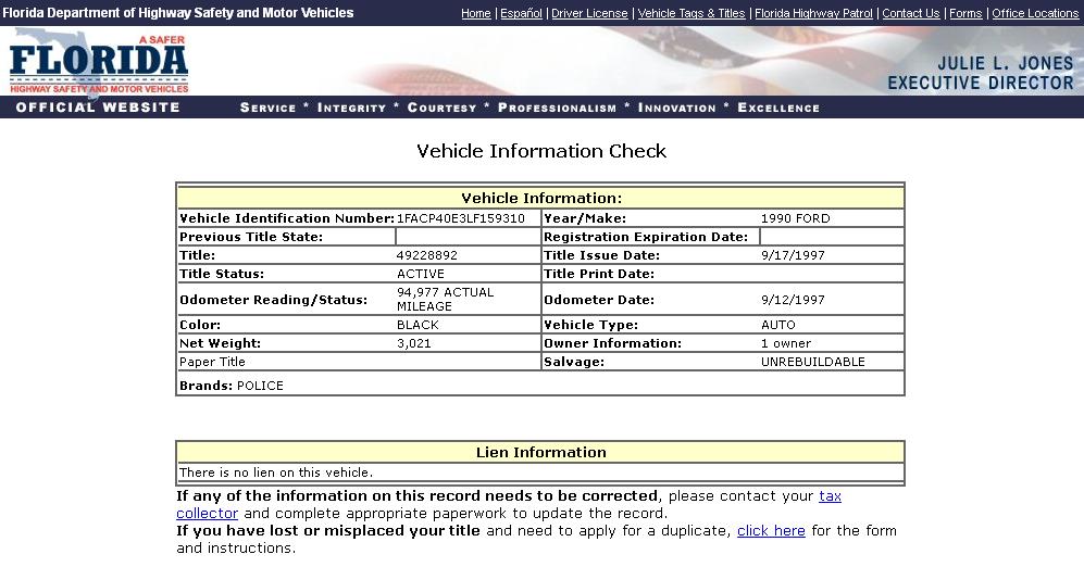 Using the State of Florida DMV Vehicle Information Search Function to search for VINs,