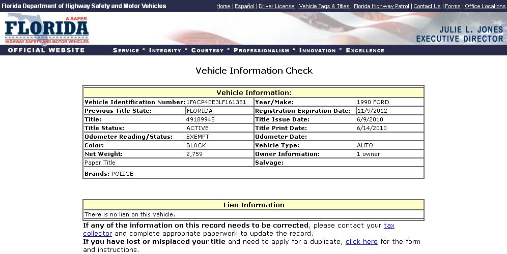 Using the State of Florida DMV Vehicle Information Search Function to search for VINs, This car also appears to have had a second life after the FHP, having been used in some capacity by the Jacksonville Sheriffs Office - |