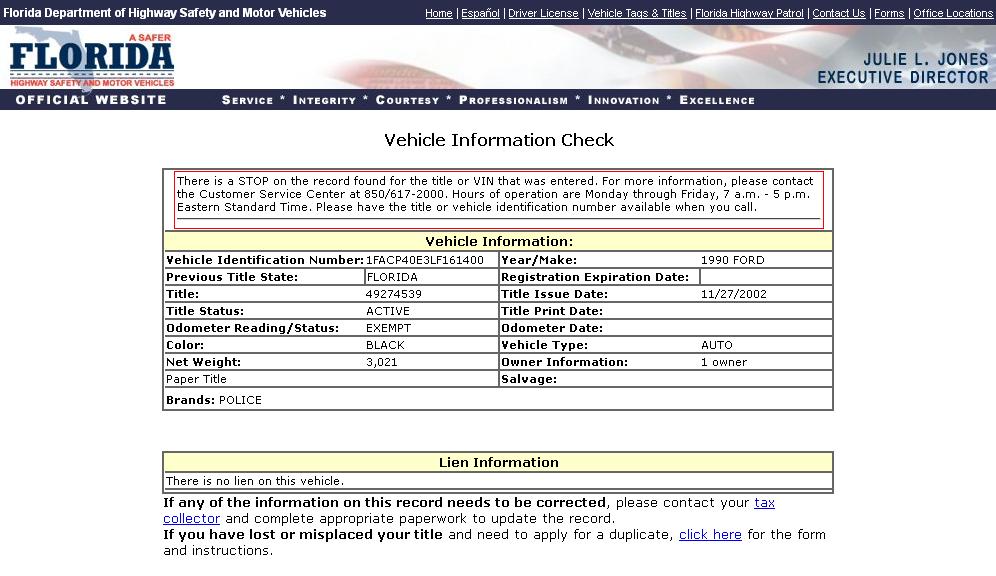 Using the State of Florida DMV Vehicle Information Search Function to search for VINs,