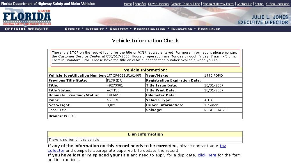 Using the State of Florida DMV Vehicle Information Search Function to search for VINs,