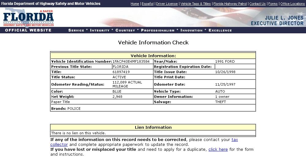 Using the State of Florida DMV Vehicle Information Search Function to search for VINs,