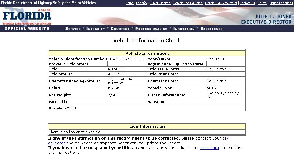 Using the State of Florida DMV Vehicle Information Search Function to search for VINs,