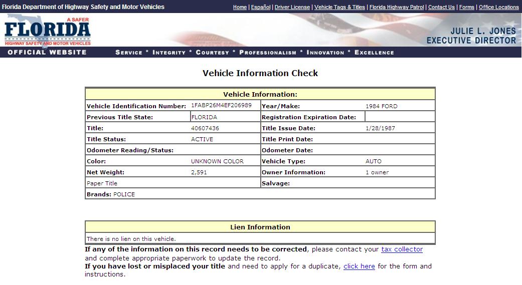 Using the State of Florida DMV Vehicle Information Search Function to search for VINs,