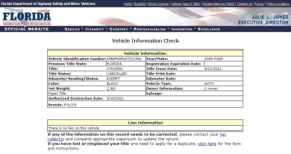 Using the State of Florida DMV Vehicle Information Search Function to search for VINs,