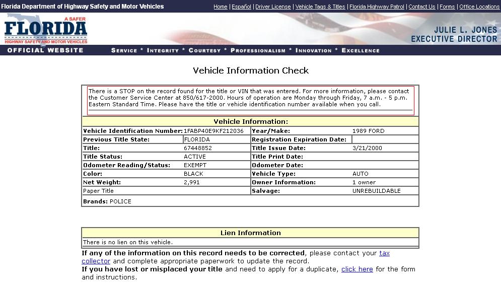 Using the State of Florida DMV Vehicle Information Search Function to search for VINs,