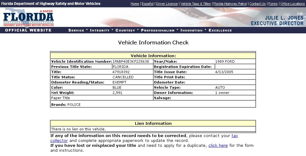 Using the State of Florida DMV Vehicle Information Search Function to search public records on vehicles, we have found title information on cars within the suspected range of VINs that show a Police Branded title. This car has a Police Branded title, and is within the range of suspected FHP Mustangs from DSO #21-0266.