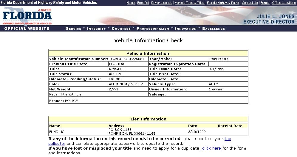 Using the State of Florida DMV Vehicle Information Search Function to search public records on vehicles, we have found title information on cars within the suspected range of VINs that show a Police Branded title. This car has a Police Branded title, and is within the range of suspected FHP Mustangs from DSO #21-0266.