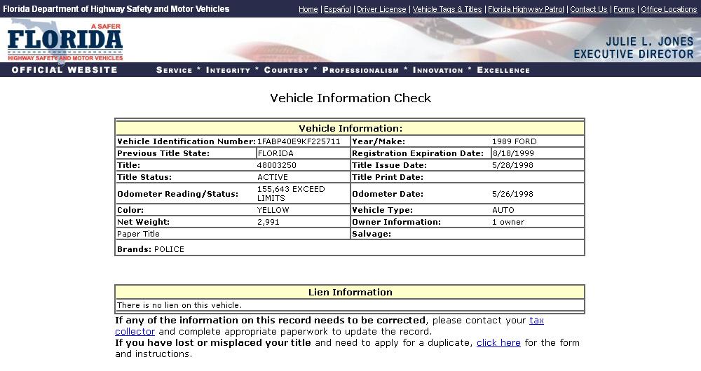 Using the State of Florida DMV Vehicle Information Search Function to search public records on vehicles, we have found title information on cars within the suspected range of VINs that show a Police Branded title. This car has a Police Branded title, and is within the range of suspected FHP Mustangs from DSO #21-0266. ![]() |