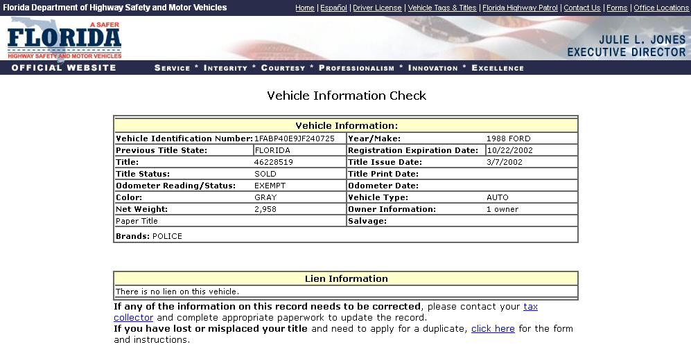 we used the State of Florida DMV Vehicle Information Search Function to search for VINs, and have