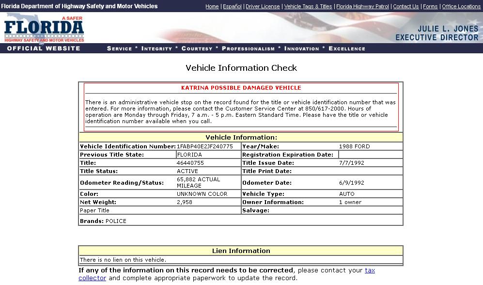 Using the State of Florida DMV Vehicle Information Search Function to search for VINs, we