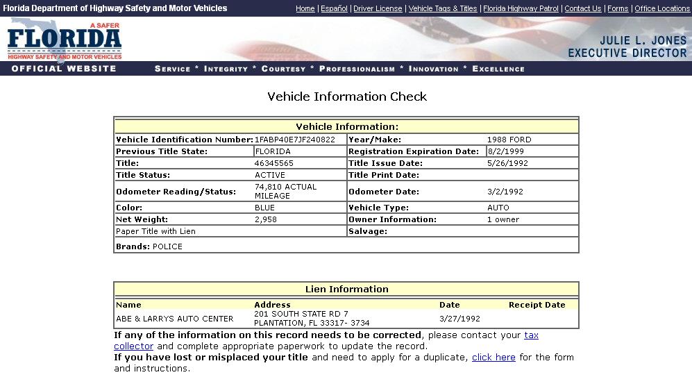 we used the State of Florida DMV Vehicle Information Search Function to search for VINs, and have
