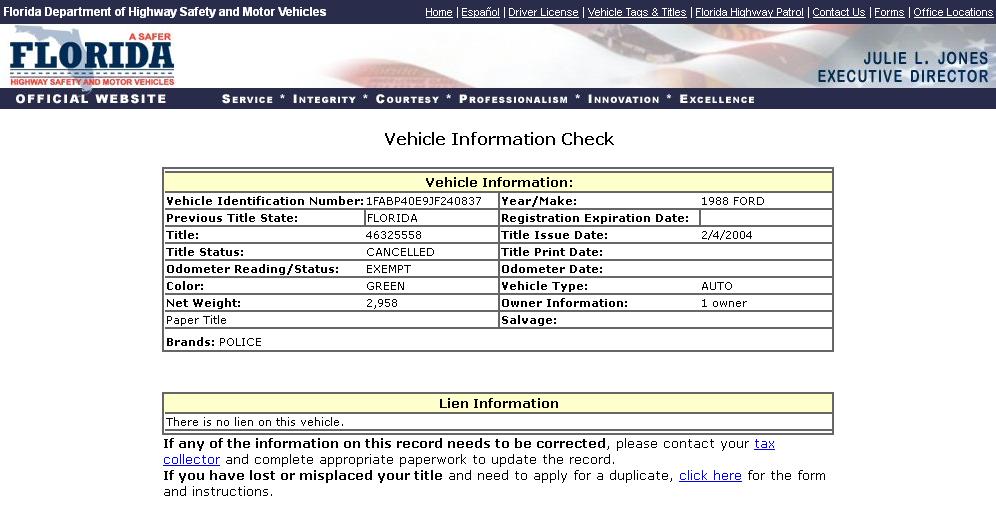 we used the State of Florida DMV Vehicle Information Search Function to search for VINs, and have