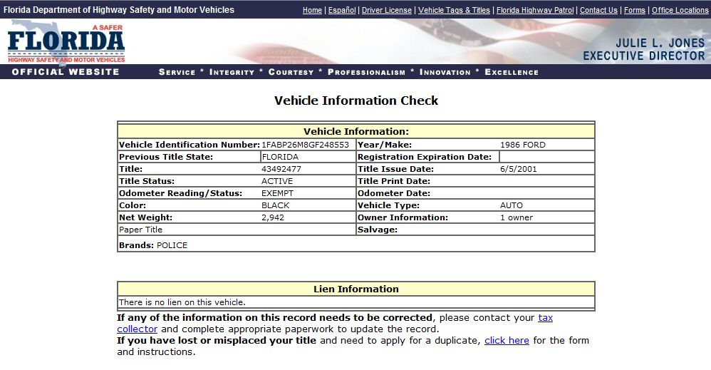 Using the State of Florida DMV Vehicle Information Search Function to search for VINs,