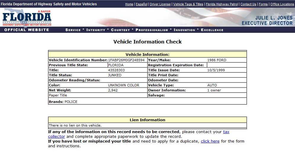 Using the State of Florida DMV Vehicle Information Search Function to search for VINs,