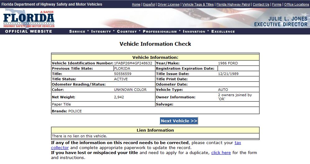 Using the State of Florida DMV Vehicle Information Search Function to search for VINs,