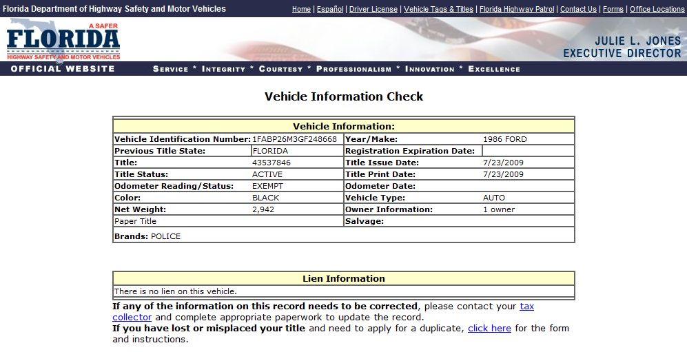 Using the State of Florida DMV Vehicle Information Search Function to search for VINs, we have found title information on cars within the suspected range of VINs that show "POLICE" on the title. This car has a police branded title.