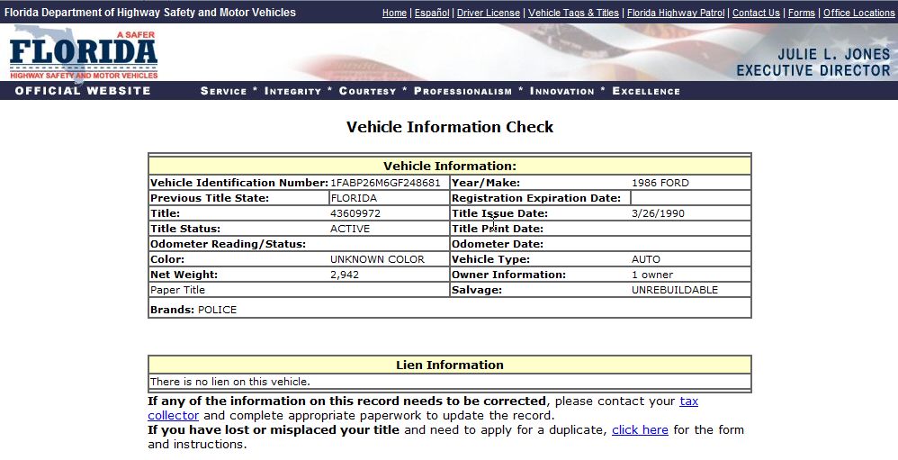 Using the State of Florida DMV Vehicle Information Search Function to search for VINs,