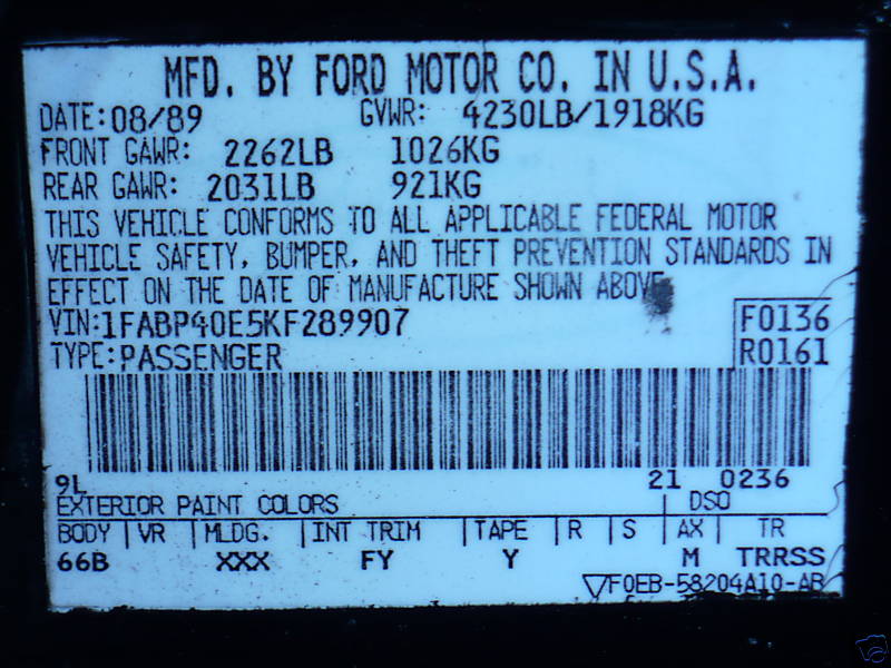 1989 SSP - VIN 1FABP40E5KF289907
