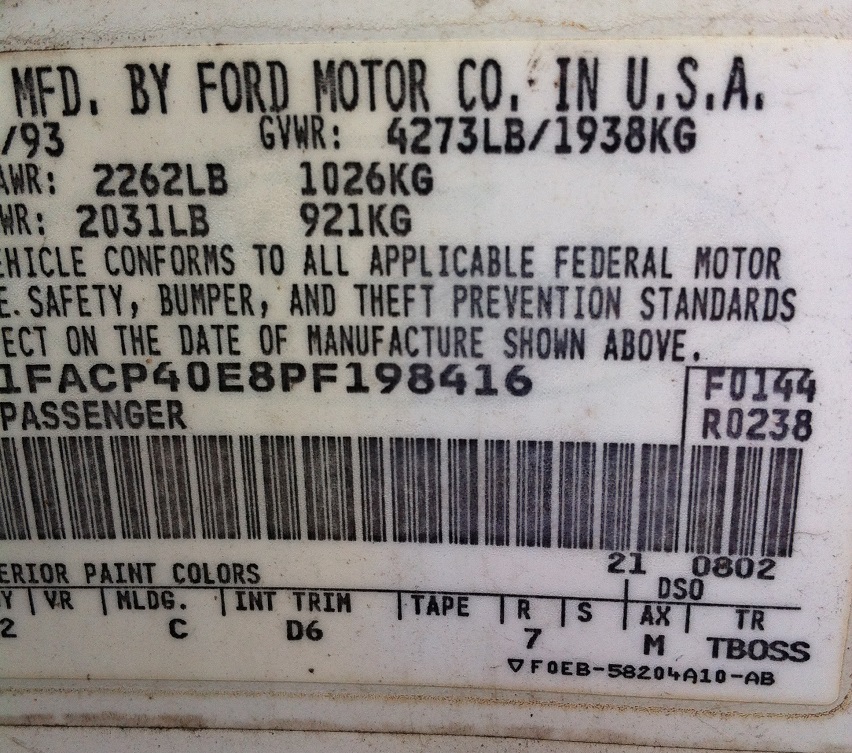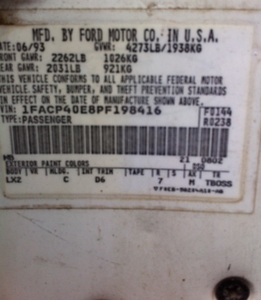 1993 SSP - VIN 1FACP40E8PF198416
