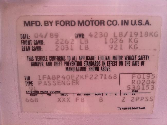 1989 SSP - VIN 1FABP40E2KF227168